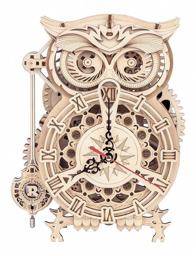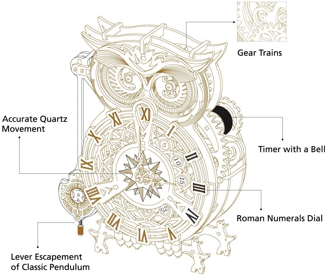 Forma de búho con elementos mecánicos detallados que despiertan admiración y aportan elegancia al interior.