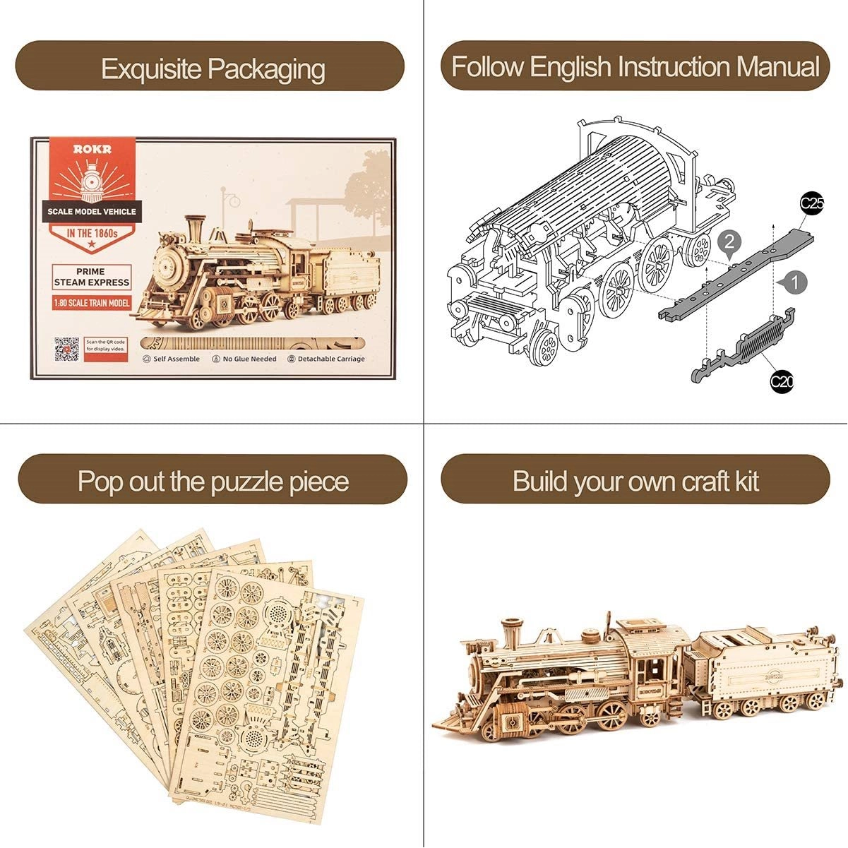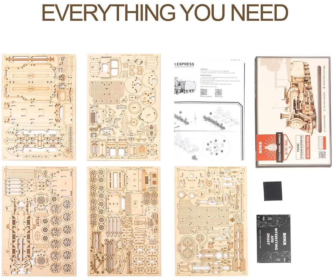 Disfruta de la diversión y la creatividad con el modelo 3D de madera Prime Steam Express. Este tren histórico data de 1860 y forma parte de la serie ROBOTIME ROKR Model Vehicles Series. Todas las piezas están cuidadosamente cortadas con láser a partir de contrachapado de tilo de 2 mm de grosor. No se necesita pegamento para el montaje y el modelo cuenta con detalles realistas, como silbato de vapor, ruedas de eje y ténder desmontable.