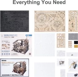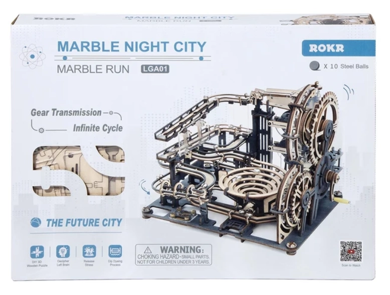 ROKR Marble Night City es un impresionante modelo 3D de pista de canicas para montar que combina diversión y aprendizaje. Este modelo consta de 294 piezas cortadas con precisión que forman una pista compleja con diversos obstáculos y mecánica accionada manualmente mediante el giro de una manivela. El paquete incluye un manual completo que te guía durante el proceso de montaje.