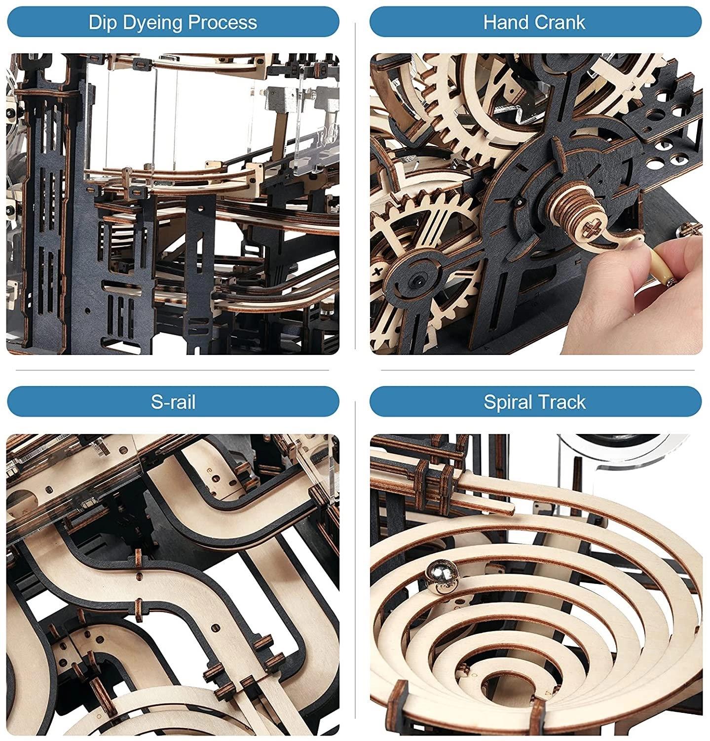 El rompecabezas incluye un detallado sistema de engranajes y pistas que ofrecen una vista de la mecánica accionada a mano.