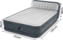 La bomba eléctrica integrada permite un inflado y desinflado rápidos y sin esfuerzo. La agradable superficie de terciopelo es suave con la piel y mejora la sujeción de la sábana. El cabecero inflable integrado proporciona apoyo para leer y descansar. La cama se entrega con bolsa de transporte y parche de reparación.