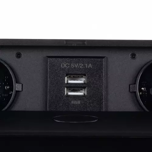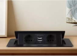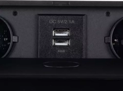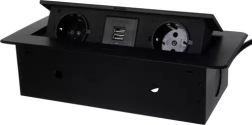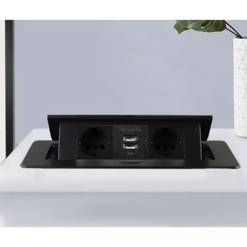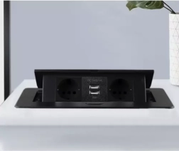 Elegante solución de alimentación empotrada para mesas, encimeras de cocina y salas de reuniones: módulo con 2 tomas Schuko y 2 USB (5 V/2,1 A) en un resistente cuerpo metálico. Gracias a su mecanismo abatible discreto, permanece oculto cuando no se utiliza, y con su marco plano queda perfectamente a ras de la superficie. Ofrece rendimiento fiable de hasta 3300 W y carga rápida para teléfonos y accesorios.