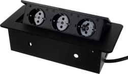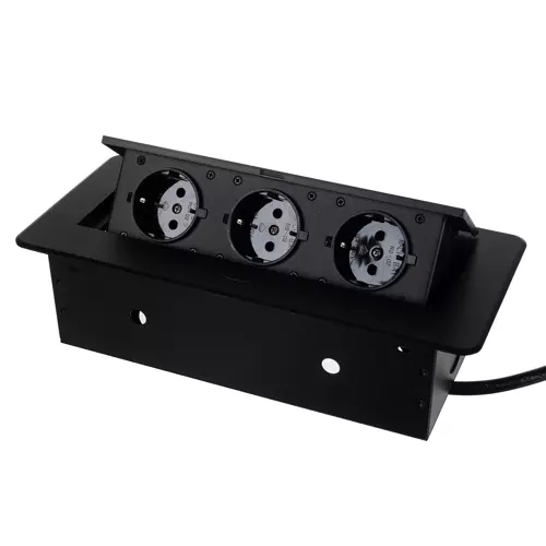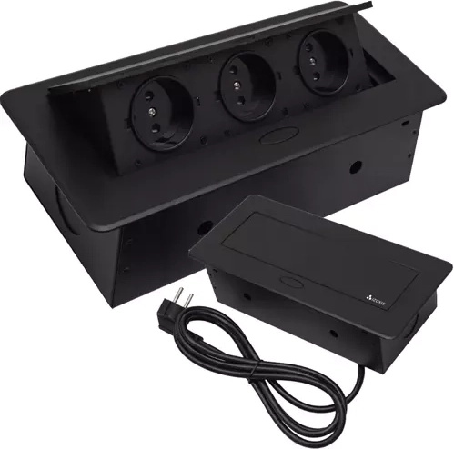 Esta toma triple empotrada IZOXIS combina un diseño moderno con una solución práctica para hogares, oficinas y salas de conferencias. El fino borde plano se integra perfectamente con la superficie y el acabado en negro combina con la mayoría de interiores. El trabajo metálico de alta calidad garantiza durabilidad y larga vida útil.