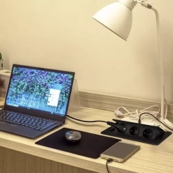 El panel está destinado a montaje en encimeras de trabajo, sobres de mesa o mesas de conferencias, tanto vertical como horizontalmente. Al presionar el botón, las tomas se elevan suavemente por encima de la superficie; después del uso, simplemente se ocultan para mantener un espacio de trabajo ordenado y seguro.