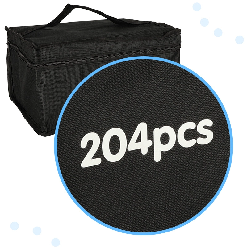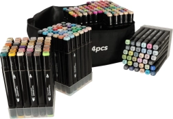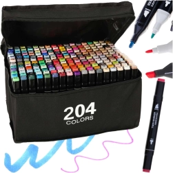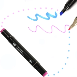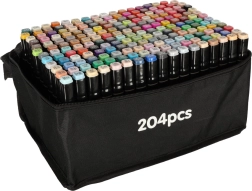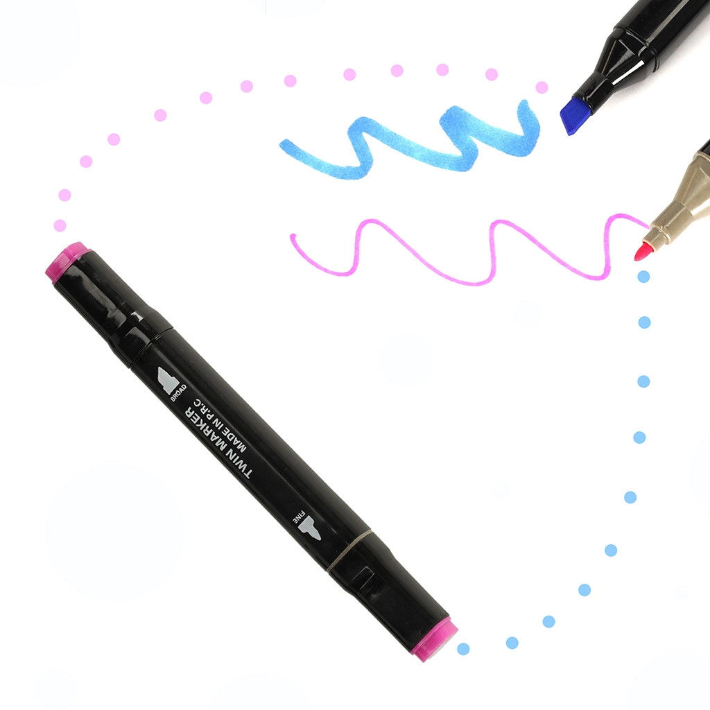 Cada rotulador tiene dos puntas: una ancha para colorear rápidamente superficies grandes y otra fina para líneas precisas y detalles. El práctico soporte mantiene los colores a mano y ordenados, mientras que el estuche con cremallera facilita el transporte de todo el set.