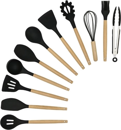 El juego de utensilios de cocina de la marca Ruhhy incluye 12 herramientas variadas, entre ellas espátulas, cucharones y un cepillo, todas con mangos de madera ergonómicos y cabezas de silicona resistentes. Estas herramientas son resistentes a altas temperaturas, fáciles de limpiar y evitan rayar tu menaje de cocina.