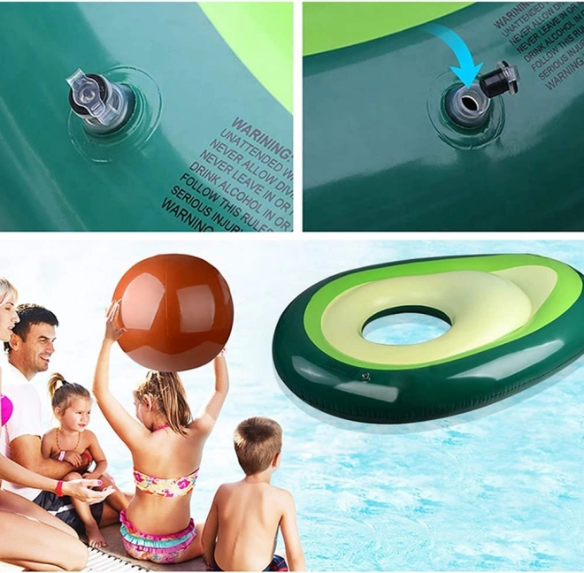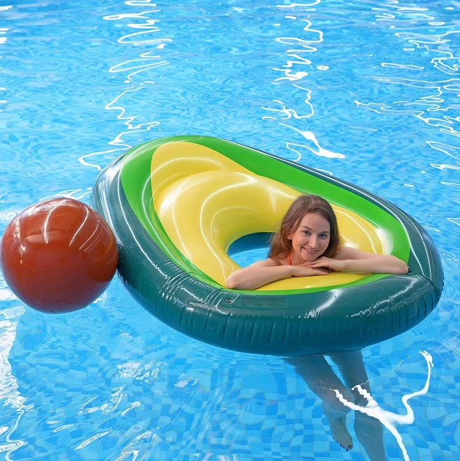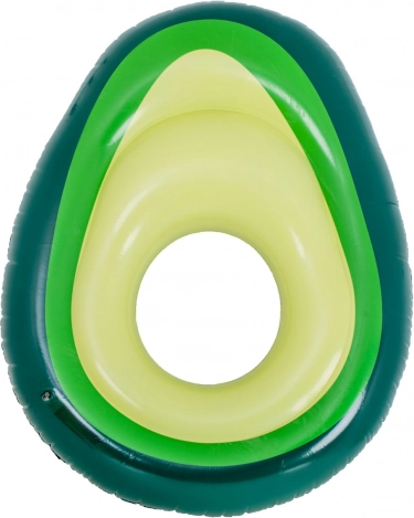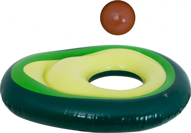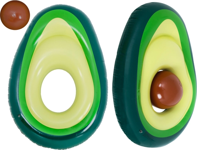 La colchoneta original con forma de aguacate maduro iluminará cualquier piscina y playa. El “hueso” desmontable funciona como pelota independiente para el agua y juegos de playa, o como almohada/respaldo para tumbarse en el agua. El centro abierto convierte la colchoneta en un aro estable para relajarse y para aprender a nadar.