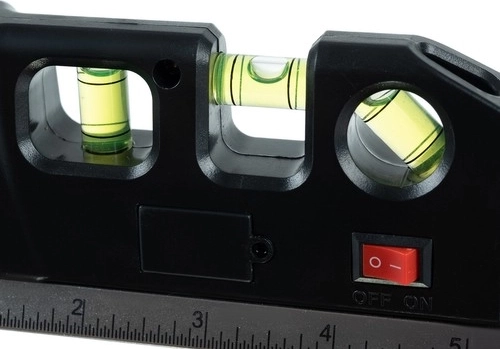 El nivel cuenta con una cinta métrica plegable de 250 cm con escala doble en centímetros/mm y pies/pulgadas.
