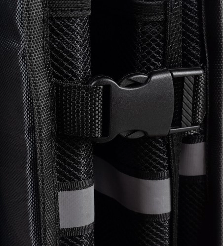 Las robustas asas metálicas convierten el organizador en una práctica bolsa. Sin volver a embalar, sacas todo a la vez y lo llevas cómodamente; los elementos reflectantes aumentan la seguridad.