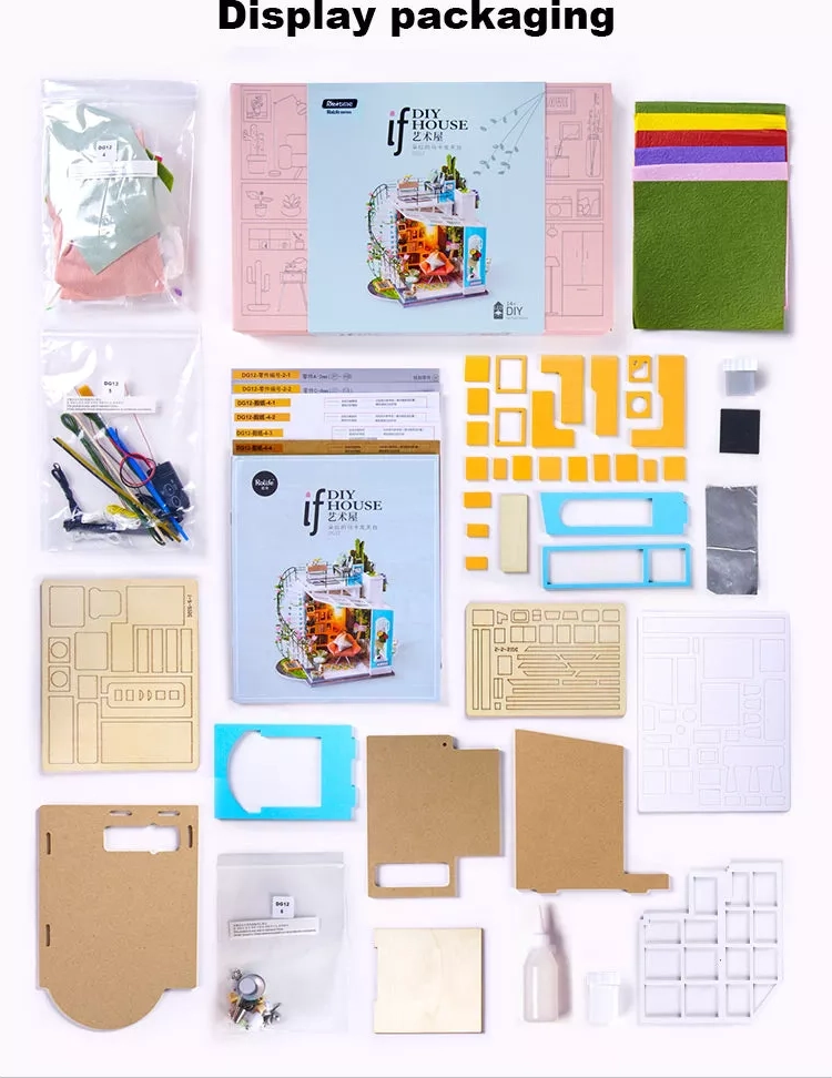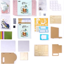 El kit se suministra desmontado e incluye todas las herramientas necesarias, incluido pegamento, pinturas y pincel. Durante el montaje se trabaja principalmente con piezas ya cortadas de contrachapado, elementos de cartón y de tela. Para una instalación cómoda de la iluminación recomendamos usar alicates de punta redonda, aunque unas tijeras comunes también son suficientes.