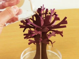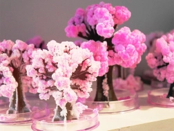 Tras el riego, en pocas horas se forman delicados cristales rosados que imitan la sakura en flor y transforman el sencillo arbolito en una decoración llamativa.