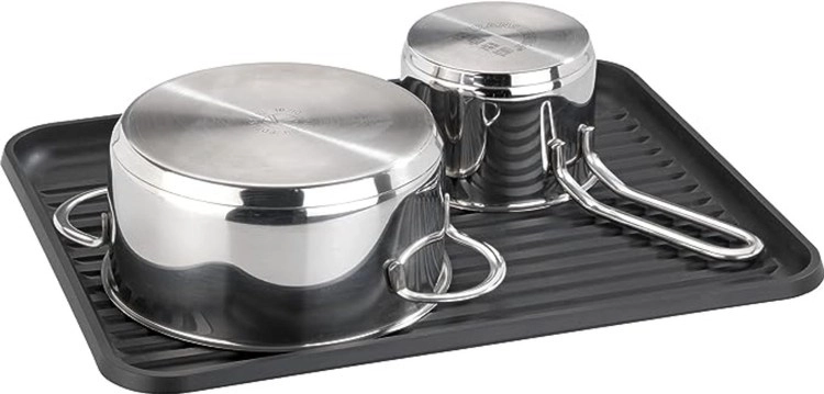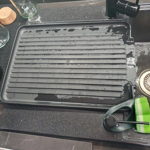 La bandeja especialmente moldeada, con estriado y salida lateral, conduce el agua directamente al fregadero. Así, la encimera permanece seca y limpia.