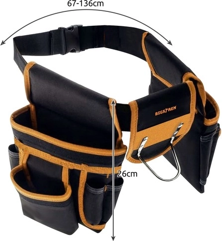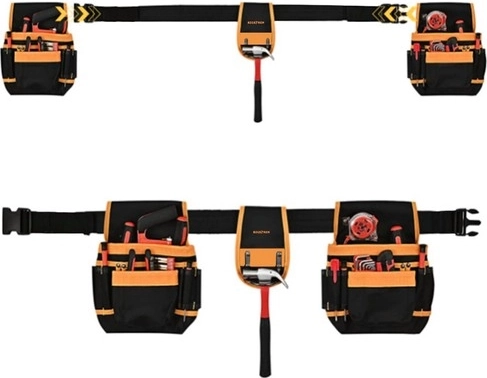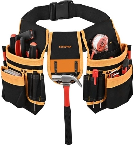 El cinturón de herramientas Bigstren está equipado con 22 bolsillos, incluidos dos bucles y un soporte para martillo, lo que permite guardar y transportar de forma segura diversas herramientas como destornilladores, llaves, alicates, cintas métricas e incluso herramientas eléctricas.