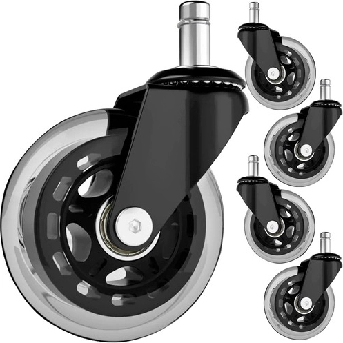 Juego de cinco ruedas apto para sillas de oficina, gaming, giratorias o infantiles, compatible con la mayoría de sillas del mercado con eje de 11 mm de diámetro.