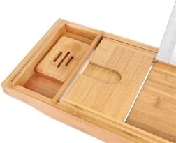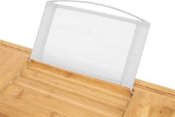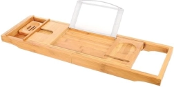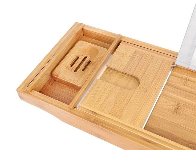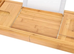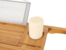 La práctica distribución incluye soporte para tablet/libro con respaldo metálico y 3 posiciones, abertura para copa, jabonera extraíble e inserto para toalla, además de un hueco para vela o aromatizador. La madera de bambú es naturalmente resistente a la humedad, fácil de mantener y aporta un toque elegante al baño.