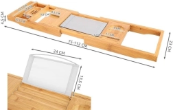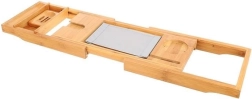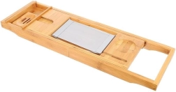 Crea un ambiente de spa en casa. La repisa extensible de bambú se apoya de forma segura en los bordes de la bañera y mantiene a mano todo lo que necesitas: desde el móvil y el libro hasta la bebida o los cosméticos. Gracias a su longitud regulable de 75–112 cm, encaja en la mayoría de las bañeras.