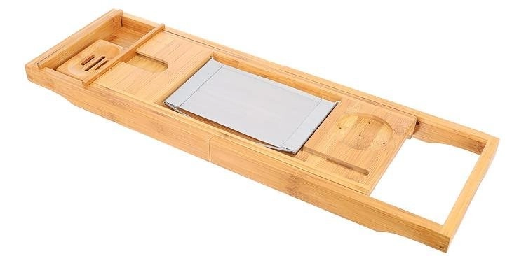 Disfruta de un baño relajante con esta elegante repisa de bambú que ofrece longitud extensible, soporte para libro o tablet con 3 ángulos de inclinación, espacio para una copa de vino, jabonera, inserto extraíble para toalla y hueco para una vela. El resistente bambú es impermeable, se seca rápido y se limpia con facilidad, ideal para tu spa en casa.