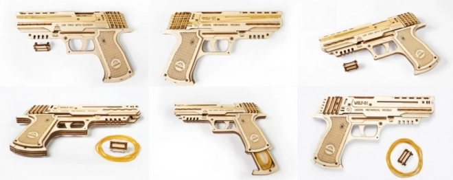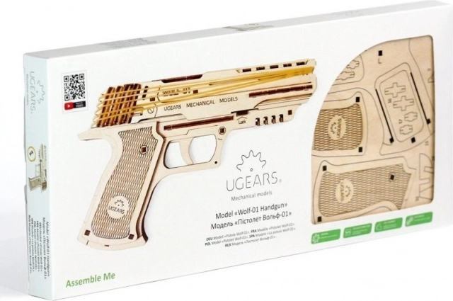 El UGEARS Wolf-01 es una réplica de madera detallada de una pistola con accionamiento por goma elástica que montarás sin pegamento usando únicamente piezas cortadas con precisión. Una vez ensamblado, obtendrás un modelo mecánico funcional que dispara gomas de forma fiable y te muestra en la práctica cómo cooperan los engranajes, el mecanismo del gatillo y la elasticidad de los materiales.