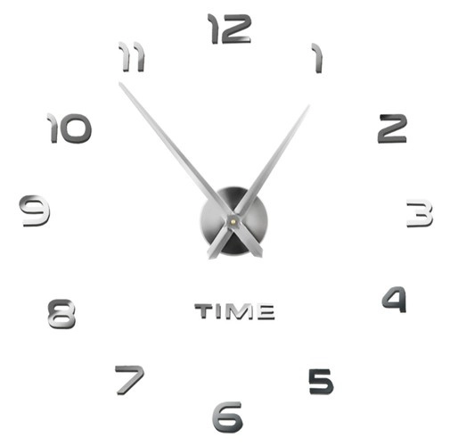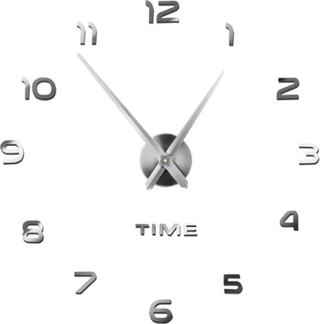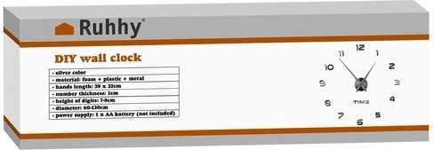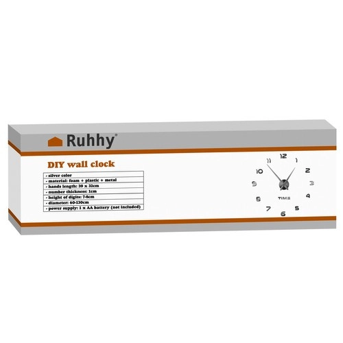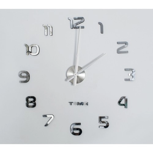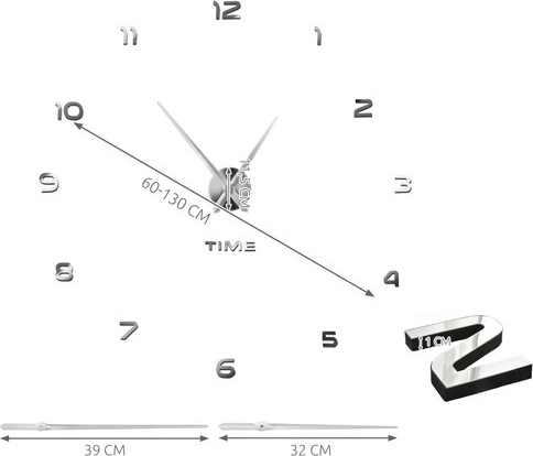 Moderno reloj de pared para montaje DIY con diámetro ajustable de 60–130 cm que decora cualquier interior. Los números 3D plateados brillantes con efecto espejo crean un diseño elegante, y el funcionamiento silencioso y fluido sin tictac garantiza tranquilidad en el salón y el dormitorio. Gracias a la plantilla incluida y a los números autoadhesivos, el montaje es rápido y sencillo. Alimentación con 1× pila AA (no incluida).