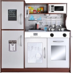 Incluye menaje y utensilios metálicos: olla, sartén, tapa y 4 cucharas de cocina (cazo, para espaguetis, cuchara colador, cazo para pasta). El fregadero extraíble permite “lavar” los platos después del juego. Su diseño atemporal en combinación de marrón oscuro y blanco encaja en cualquier habitación infantil.