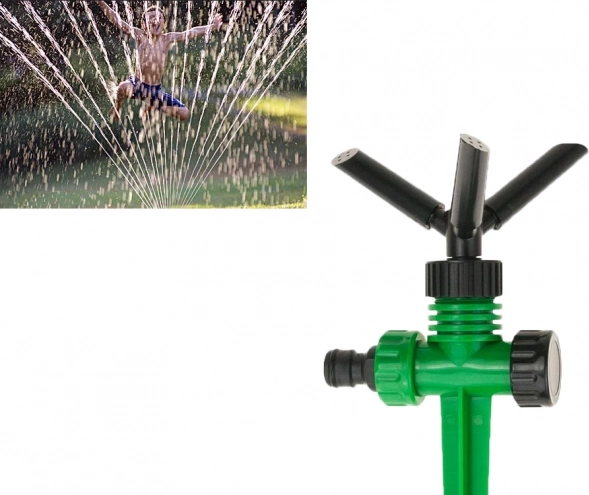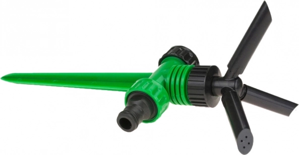 La cabeza giratoria con tres brazos distribuye el agua de manera uniforme por todo el césped y los parterres. Ideal para un riego regular sin zonas secas.