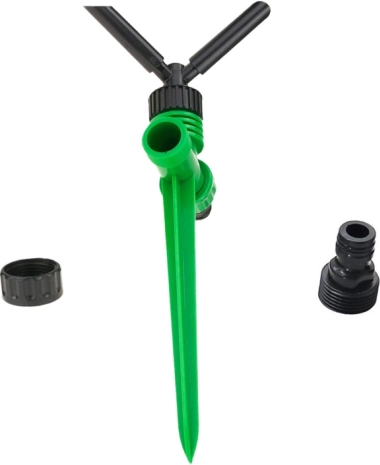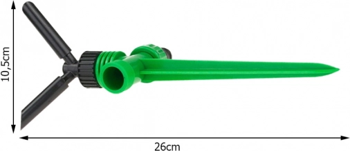 La instalación es cuestión de segundos: basta con clavar la pica en la tierra y conectar la manguera mediante un acoplamiento rápido. El resistente plástico es ligero, fácil de transportar y, con sus dimensiones compactas de 26 × 10,5 cm, cabe en cualquier sitio. Para superficies más grandes, puedes conectar varios aspersores en serie y lograr una cobertura perfectamente uniforme.