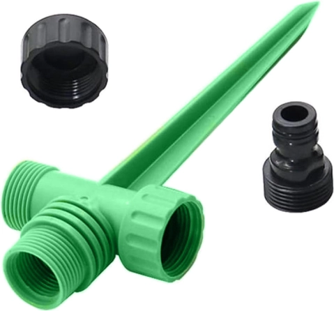 Solo hay que clavar el aspersor en el suelo y conectarlo mediante un acoplamiento rápido. Además, se puede conectar en serie con otros rociadores para cubrir superficies más grandes.