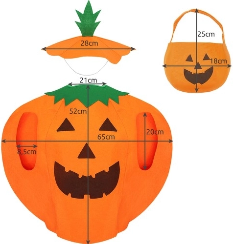 Te presentamos el disfraz infantil de calabaza perfecto para Halloween. Este set es universal gracias a sus medidas y se ajusta sin problemas tanto a niños pequeños como mayores. Es ideal para ocasiones festivas y tranquiliza a cualquier niño por su comodidad.