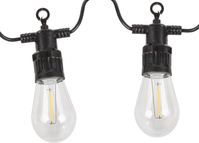 La cadena termina en un conector roscado estanco, por lo que puede unir varias guirnaldas y adaptar la longitud a sus necesidades. Las tulipas transparentes de las bombillas están fabricadas en plástico resistente, ligero y práctico para traslados frecuentes y uso estacional.