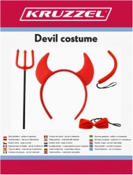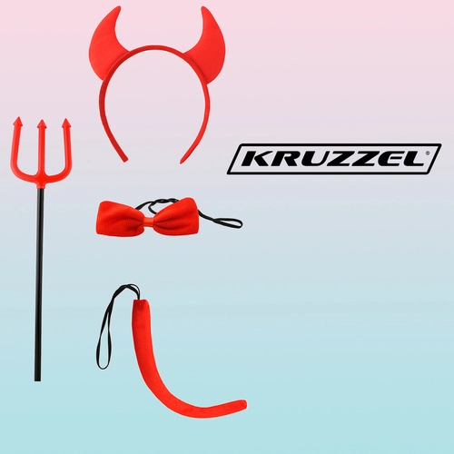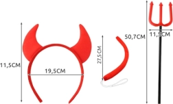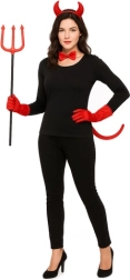 Cuernos, lazo, cola y tridente, todo a juego en color rojo para un look diabólico al instante sin buscar más accesorios.