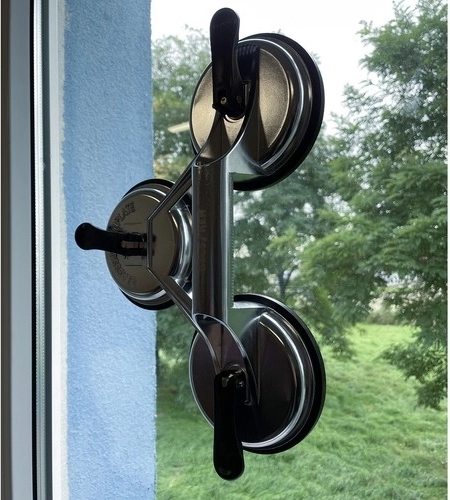 Tres grandes ventosas distribuyen la carga y permiten manipular paneles pesados y frágiles sin riesgo de daño.