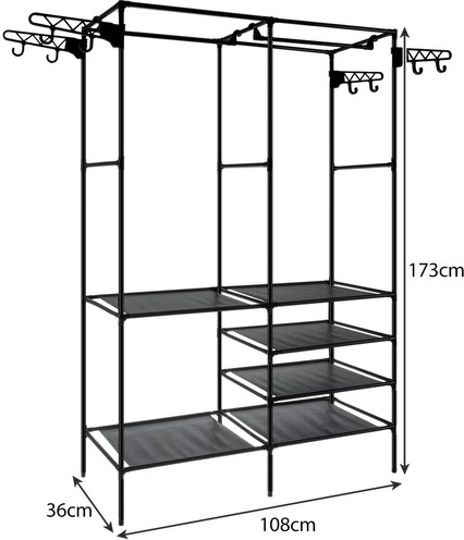 Seis estantes, una barra para ropa y ocho ganchos laterales para ropa, calzado, cajas y accesorios. El diseño abierto garantiza una visión rápida y un acceso sencillo.
