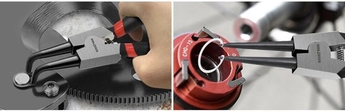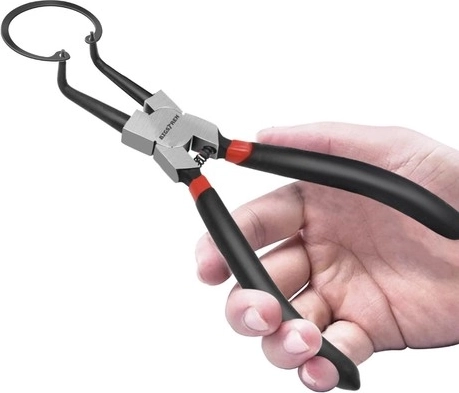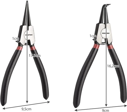 Juego práctico para servicio, taller y reparaciones en el hogar. Con los alicates para anillos Seeger puede abrir o cerrar anillos de retención de forma fácil y segura en lugares de difícil acceso. Los mangos largos y antideslizantes garantizan un agarre firme y una guía precisa de la herramienta.