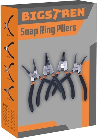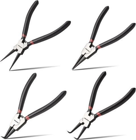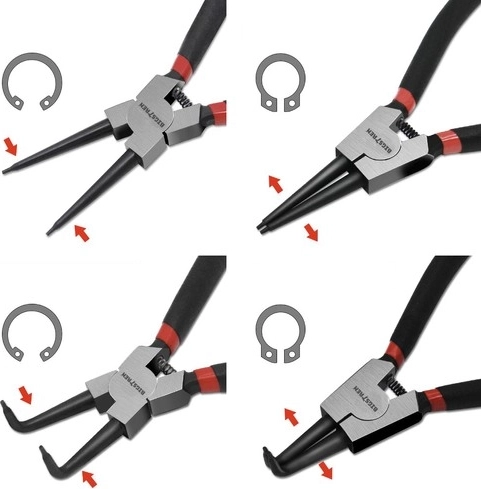 Juego universal de alicates para anillos Seeger para el montaje y desmontaje de anillos de retención internos y externos. Incluye 4 alicates — 2 rectos y 2 curvos — de resistente acero para herramientas con mangos antideslizantes y mecanismo de resorte para un trabajo preciso y seguro.