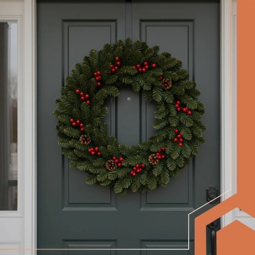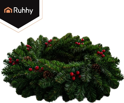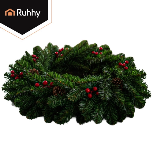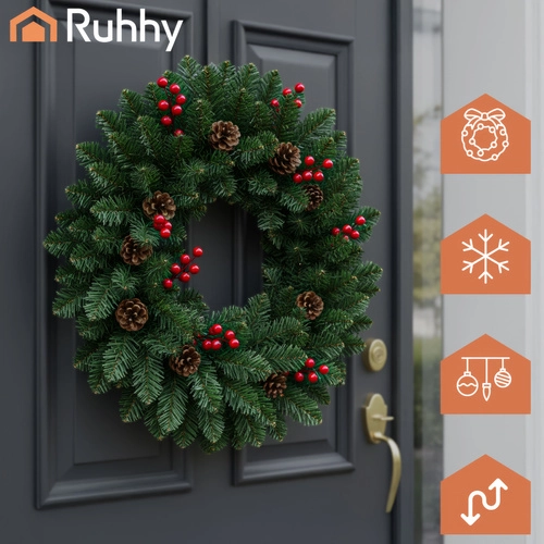 La elegante combinación del follaje verde, las bayas rojas y las piñas de aspecto natural crea una decoración festiva llamativa para puertas, paredes y cornisas.