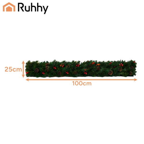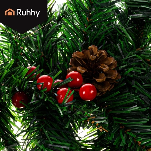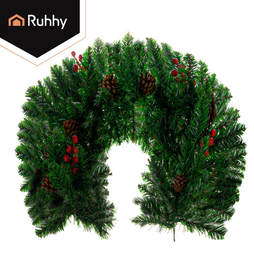 Elegante guirnalda navideña de 1 m con denso follaje de PVC, ideal para decorar puertas, balcones, barandillas o columnas. Gracias a su plasticidad, se moldea fácilmente según tus necesidades, desde un borde recto hasta decoraciones circulares de varias capas. Las piñas integradas y las ramitas con bayas rojas aportan un toque natural y elegante.