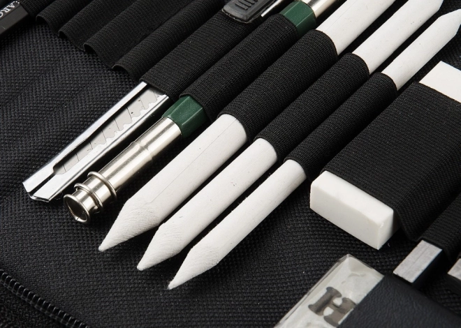 Incluye también difuminadores (tortillones de papel) en tres diámetros, cúter de encuadernador, sacapuntas doble y clásico, goma moldeable y goma clásica, y un set de papeles de lija para un afinado perfecto de la punta. Es ideal para retrato, dibujo técnico y bocetos artísticos.