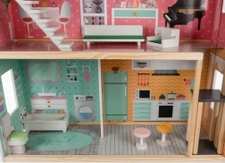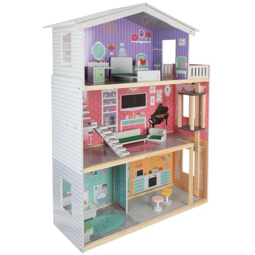 Esta amplia casita de muñecas en colores suaves y discretos fomenta la imaginación y el juego de roles. La estructura abierta da acceso a todas las estancias, para que los niños puedan jugar fácilmente en la sala, la cocina, el dormitorio y el baño, y no falta el balcón.