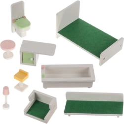 - Casita, cama, tocador, inodoro, bañera, sofá, sillón, mesa, taburete alto (silla de bar), lámpara, escaleras