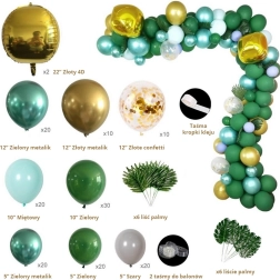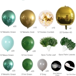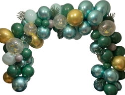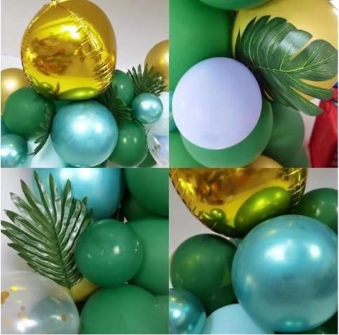 El montaje es sencillo: infla los globos con aire o helio y fíjalos a la tira con ojetes. Distribuye los globos más pequeños alrededor para un efecto lleno y por capas. Las hojas tropicales y de palma aportan un toque exótico y combinan a la perfección con la paleta verde y dorada.