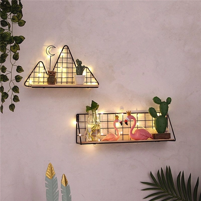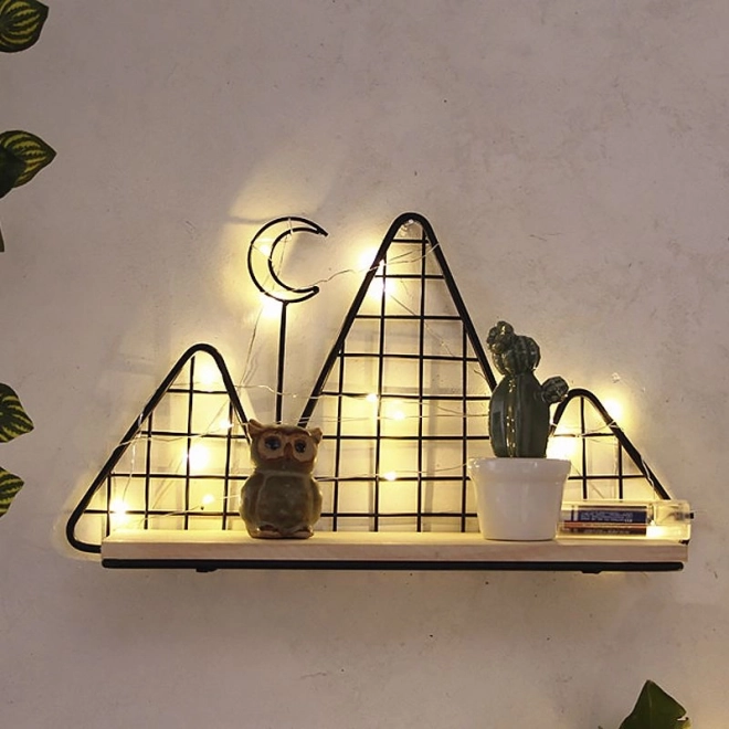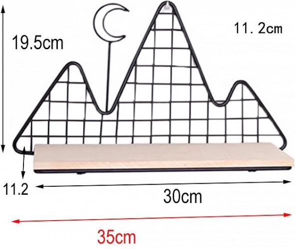 - Aspecto moderno: marco metálico negro con motivo geométrico/de montaña y balda de madera natural.