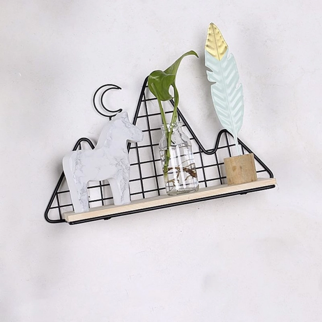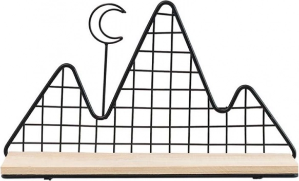 Este estante decorativo en elegante color negro combina funcionalidad y diseño. La ligera estructura de alambre con motivo de montaña aporta ligereza, mientras que la sólida balda de madera soporta con seguridad pequeños adornos, velas, plantas, marcos o tus libros favoritos.