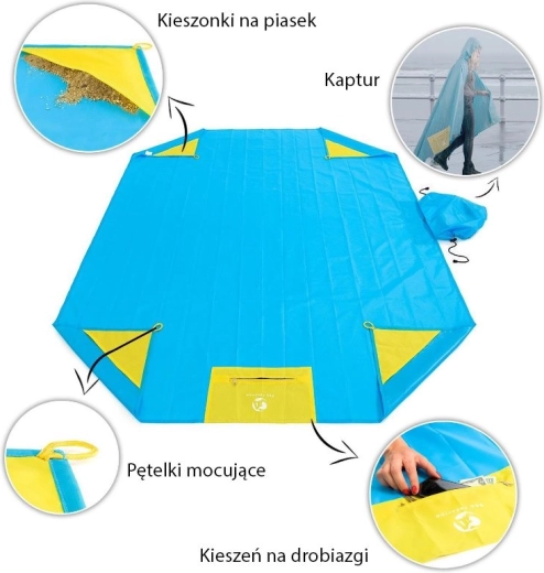 En cada esquina encontrarás ojales para anclar con piquetas y bolsillos integrados que pueden llenarse con arena o pequeñas piedras, de modo que la manta permanece estable incluso con viento. Un práctico bolsillo para pequeños objetos y la funda de transporte reducen el volumen al empacar y facilitan el transporte.