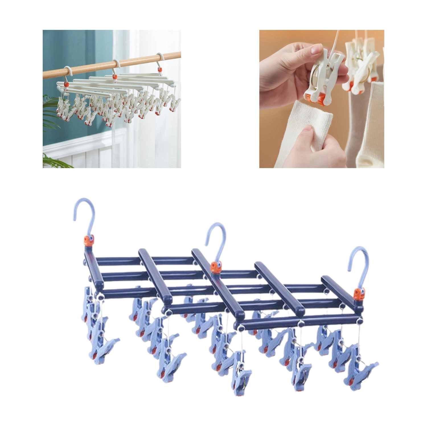 Ahorra espacio y tiempo con este tendedero plegable con 19 clips, capaz de secar muchas piezas pequeñas a la vez. El plástico resistente soporta la humedad, los clips de diseño ergonómico sujetan con firmeza y no dañan los tejidos. El gancho giratorio con cierre permite colgarlo prácticamente en cualquier lugar: en una barra, cuerda o en un tendedero clásico.