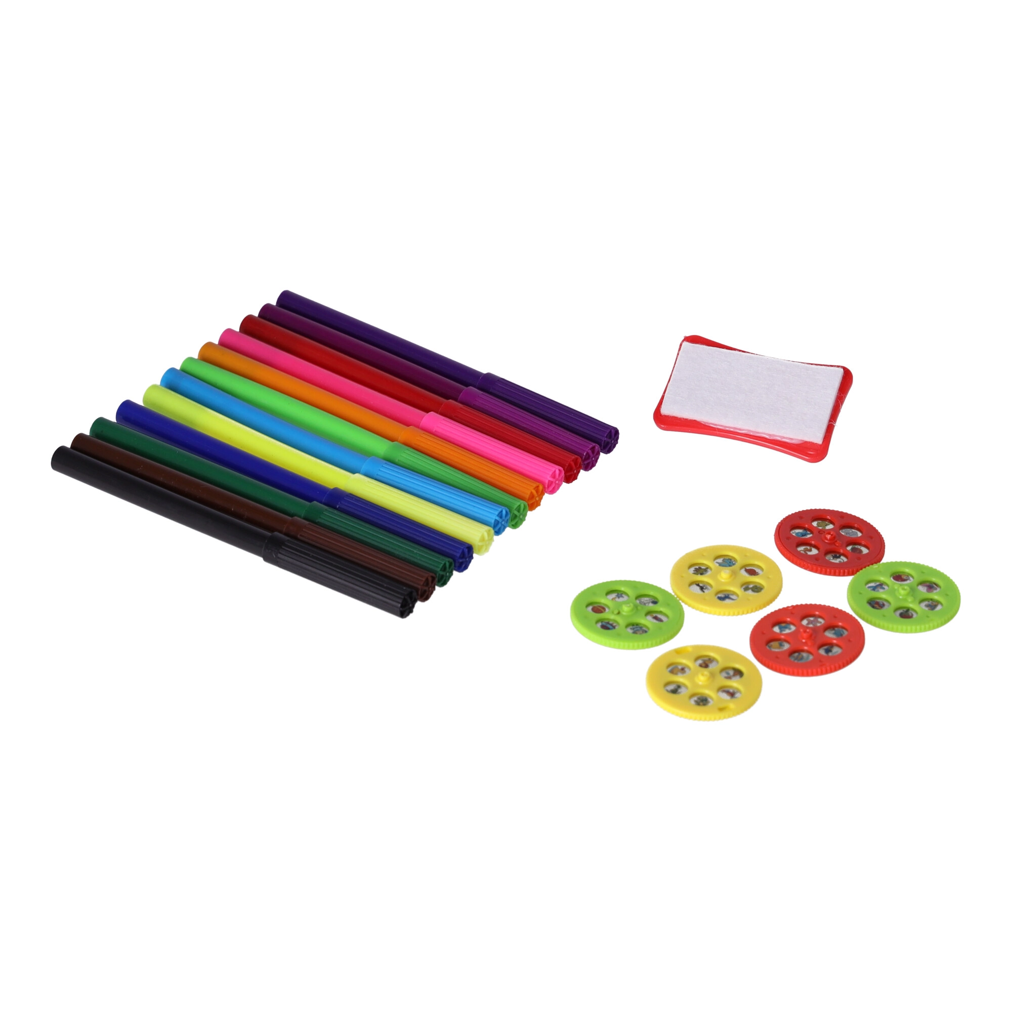 El paquete incluye 6 discos de plantillas, 12 rotuladores de colores, papel y una goma. Los niños pueden crear nada más abrirlo.