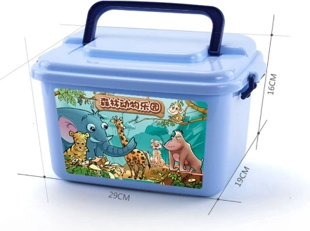 - Figuras de animales de safari y de granja, palmeras, rocas, cercados, caja de almacenamiento