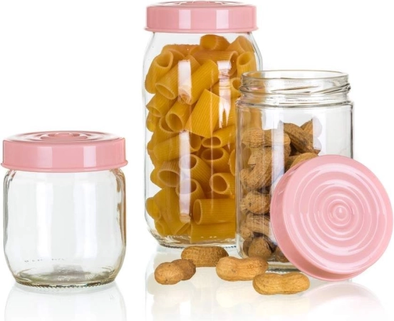 Práctico juego de tres tarros de vidrio LINZI con capacidades de 425 ml, 660 ml y 1000 ml para un almacenamiento de alimentos ordenado y visible. Cuerpos de vidrio con tapas de plástico en color rosa que garantizan un cierre firme y una mayor frescura del contenido: ideales para pastas, azúcar, frutos secos o especias. Calidad y estilo de la marca BANQUET para cualquier cocina.