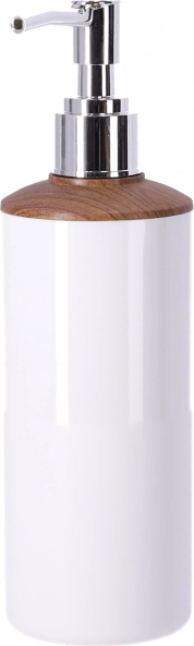 Moderno dosificador con cuerpo blanco limpio y detalle en madera que asegura una dosificación precisa y económica del jabón líquido. Se rellena con facilidad y combina a la perfección con el resto de elementos del juego.