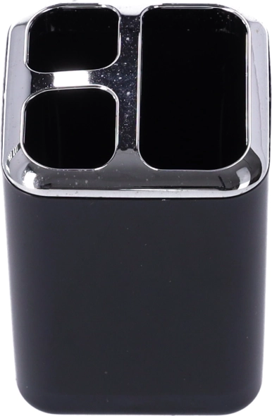 Vaso práctico con varios compartimentos que mantiene cepillos, pasta y pequeños accesorios ordenados en un solo lugar. El acento metálico y el acabado brillante complementan los baños modernos y facilitan el mantenimiento.