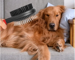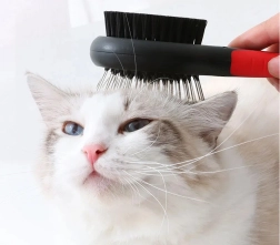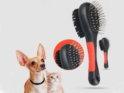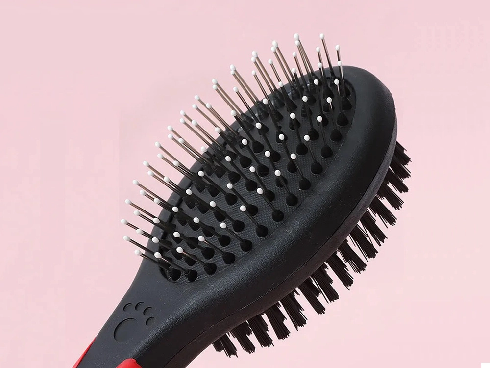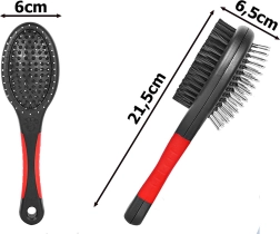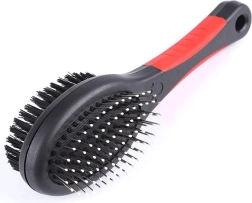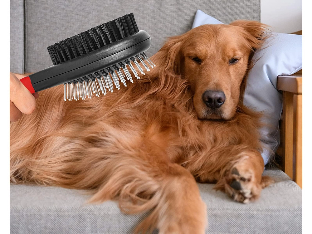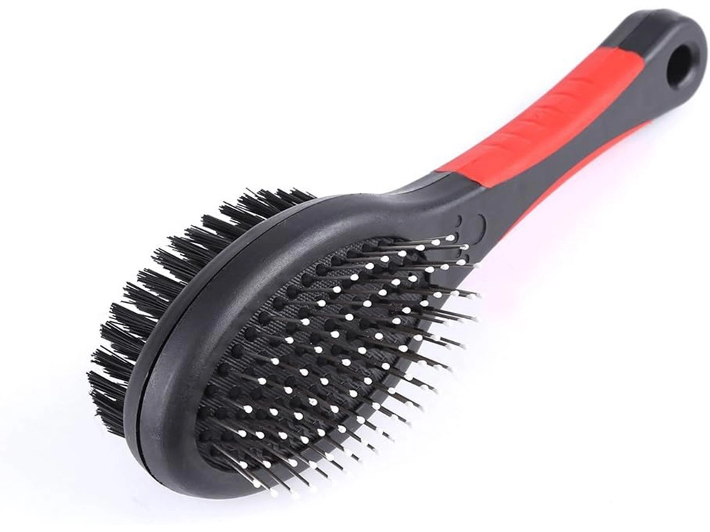 El cepillo de doble cara es una herramienta versátil para el mantenimiento regular del pelaje de tu mascota. Las púas metálicas con puntas redondeadas desenredan suavemente los nudos y ayudan durante la muda, mientras que las densas cerdas de nailon eliminan el polvo, alisan y aportan un brillo saludable al pelaje. Adecuado para pelo corto, largo, ondulado y áspero.
